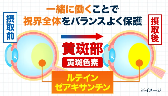 「ルテインは、目の奥にある“黄斑部”に多く含まれており、ブルーライトや紫外線から網膜を守る働きがあることが知られています。スマホやPCを日常的に使う人ほど、ルテインが不足しやすいのです。